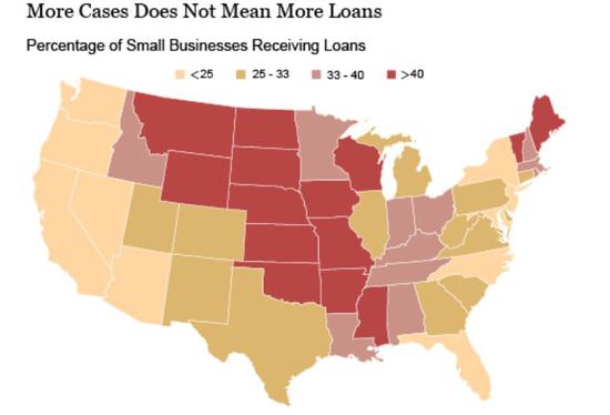 遭受疫情打击大的地区并不意味着会获得更多小企业贷款。根据美联储的分析,受新冠病毒打击最大的州获得的紧急小型企业援助贷款的比例要低于一些疫情相对不那么严重的山区和中西部州。