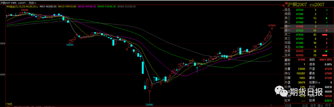 近阶段,期市“铜老大”连创新高表现强劲,重拾有色金属“领头羊”风采。截至10日下午收盘,沪铜(47440, 840.00, 1.80%)主力合约报在46830元/吨,不仅在八个交易日内累计涨幅达到6.58%,而且还创出今年春节后新高。昨日夜盘时段,沪铜价格继续高位运行,主力合约最高至47600元/吨,收报47440元/吨。