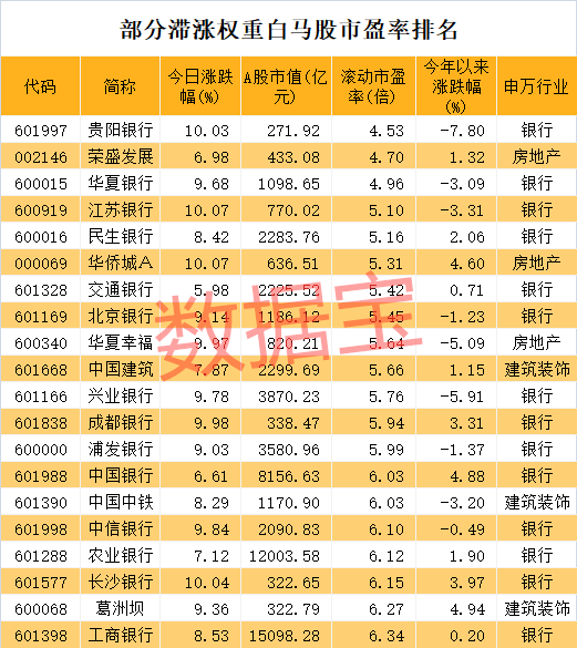 在这100只股票中,有超四成滚动市盈率在个位数水平。市盈率最低的是贵阳银行(8.450, 0.77, 10.03%),仅4.53倍。贵阳银行今日涨停,这是其近一年来的首个涨停板。其次是荣盛发展(9.960, 0.65, 6.98%)、华夏银行(7.140, 0.63, 9.68%),市盈率分别为4.7倍、4.96倍。市盈率较低的还有江苏银行(6.670, 0.61, 10.07%)、民生银行(6.440, 0.50, 8.42%)、华侨城A(7.760, 0.71, 10.07%)、交通银行(5.670, 0.32, 5.98%)、北京银行(5.610, 0.47, 9.14%)等。