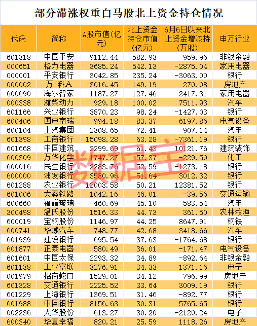 不少权重白马股是北上资金的重仓目标,数据显示,上述100股中有一半以上获北上资金持仓超过10亿元。中国平安、格力电器(61.260, 2.82, 4.83%)、平安银行(15.680, 1.43, 10.04%)、万科A(31.020, 2.37, 8.27%)、海尔智家(18.820, 0.84, 4.67%)、潍柴动力(15.510, 0.33, 2.17%)等6股北上资金持仓在百亿元以上。中国平安持仓市值582.93亿元排在首位,该股今日大涨7.9%。具体名单见下表: