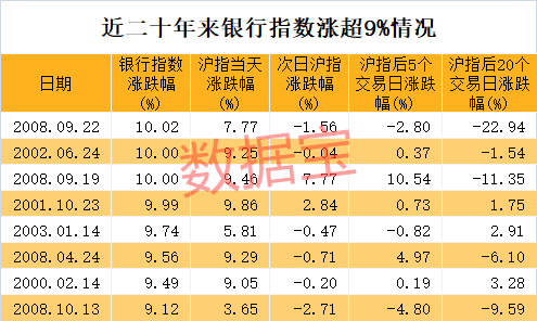 在A股历史上,银行板块如此大幅度的上涨非常少见。数据宝统计显示,近二十年来,不含今日,银行指数单日涨幅超过5%的共有81次,其中银行指数单日涨幅超过9%的仅有8次,最近的一次还要追溯到2008年,即便在行情最为火爆的2014年-2015年期间,银行指数单日最大涨幅也未曾达到9%。