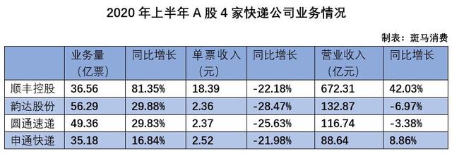 2020年上半年, 韵达股份(25.340, 0.00, 0.00%) 快递业务量56.29亿票,同比增长29.88%,快递业务营业收入132.87亿元,同比下降6.97%; 圆通速递(16.160, 1.28, 8.60%) 业务量49.36亿票,同比增长29.83%,营业收入116.74亿元,同比下降3.38%;申通快递(002468.SZ)业务量35.18亿票,同比增长16.84%,营业收入88.64亿元,同比下降8.86%。