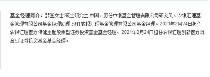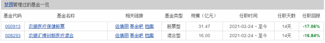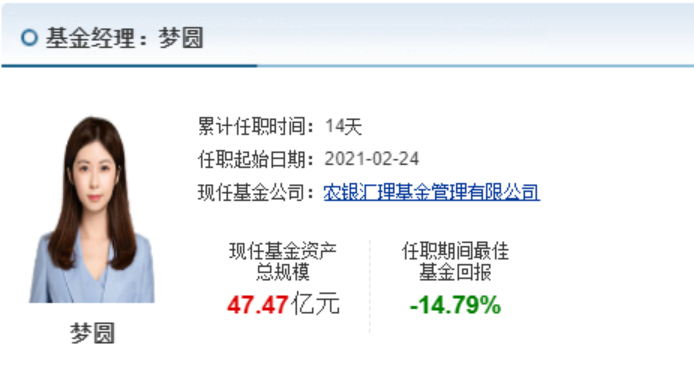从2021年2月24日担任农银汇理医疗保健和农银汇理创新医疗的基金经理算起,梦圆累计任职时间仅11个交易日,然而所管理的2只基金净值却下跌猛烈。统计数据显示,农银医疗保健股票、农银汇理创新医疗混合的最新净值分别为2.5879、1.4217,任期内的11个交易日内下跌了18.42%、18.09%,位列股票型基金倒数,同期的上证指数下跌7.66%。梦圆管理的2只基金总规模为47.47亿元,粗略估算,在任期间2只基金的浮亏近10亿元。