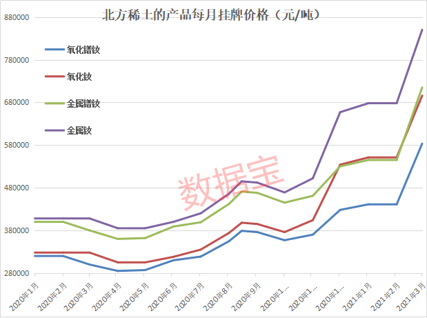 3月10日晚间,稀土巨头中国北方稀土(集团)高科技股份有限公司在官网公布3月轻稀土氧化物挂牌价,氧化镧挂牌价1.08万元/吨;氧化铈挂牌价1.08万元/吨;氧化镨钕挂牌价58.32万元/吨;氧化钕挂牌价69.58万元/吨;金属镨钕挂牌价71.5万元/吨;金属钕挂牌价85万元/吨。相比2月份的挂牌价,氧化镨钕、金属镨钕、氧化钕等数个品类的环比涨幅巨大,在25-33%之间。