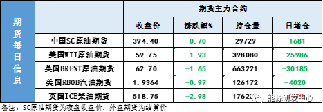 【1】WTI主力原油期货收跌1.17美元,跌幅1.93%,报59.75美元/桶;布伦特主力原油期货收跌1.05美元,跌幅1.65%,报62.7美元/桶;INE原油期货收跌0.7%,报394.4元。