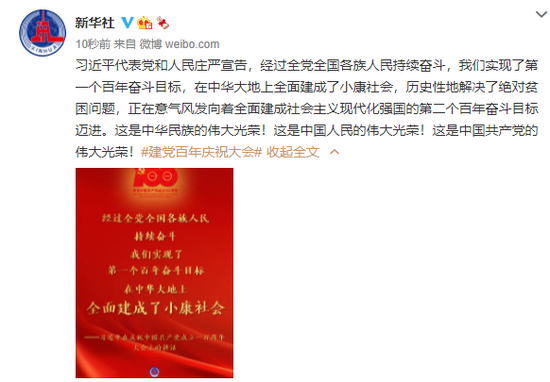 习近平代表党和人民庄严宣告,经过全党全国各族人民持续奋斗,我们实现了第一个百年奋斗目标,在中华大地上全面建成了小康社会,历史性地解决了绝对贫困问题,正在意气风发向着全面建成社会主义现代化强国的第二个百年奋斗目标迈进。这是中华民族的伟大光荣!这是中国人民的伟大光荣!这是中国共产党的伟大光荣!