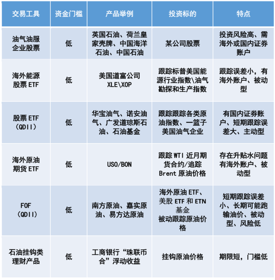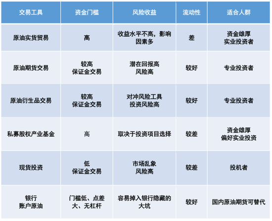 最后,借用微信朋友“落难男神收藏家”(公众号)之前提供的资料(上次2014年油价大跌之际),梳理一下各种交易工具的特点供大家参考。