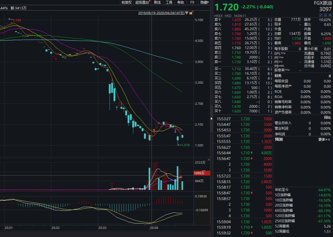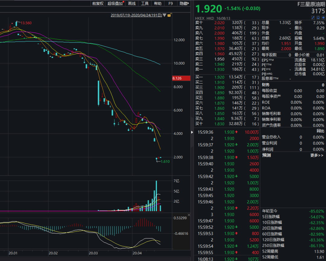 根据披露信息显示,在此次纽约油价5月份合约创下史上第一次负值之后,香港商品期货经纪公司已有两家出现穿仓!而两只在香港挂牌跟踪标普高盛原油指数的原油ETF,均出现大幅暴跌,最深跌幅高达85%。