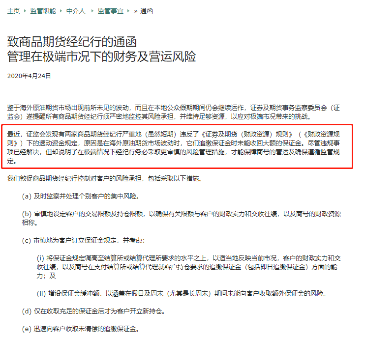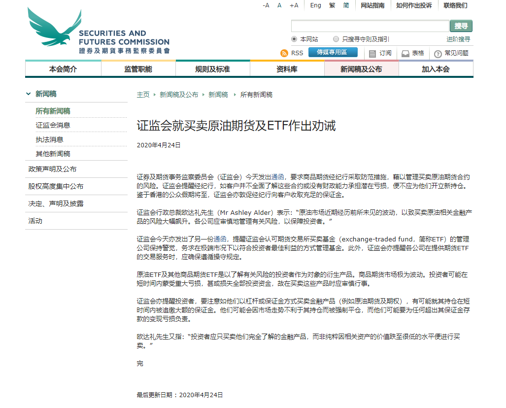 4月24日,香港证券及期货事务监察委员会(简称香港证监会)发出两份通函。一则是要求商品期货经纪公司,提醒公司向买卖原油期货客户提示风险,收取充足保证金。如果客户不全面了解潜在损失,便不应为他们开立新持仓。另一则通函则要求,ETF的管理公司保持警觉,务求在极端市况下以符合投资者最佳利益的方式管理基金。