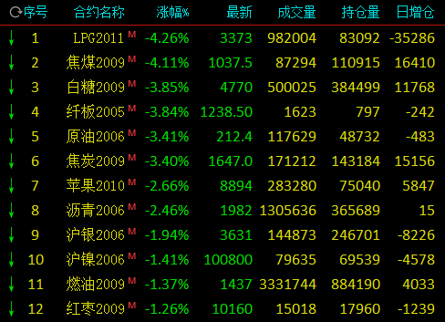 4月28日,国内期市早盘多数下跌,黑色系多数下跌,焦煤(1038, -44.50, -4.11%)跌逾4%,焦炭(1647, -58.00, -3.40%)跌逾3%;能化品涨跌不一,甲醇(1701, 30.00, 1.80%)涨近2%,LPG跌逾4%,原油跌逾3%,沥青(1982, -50.00, -2.46%)跌逾2%;基本金属多数下跌,沪镍(100800, -1440.00, -1.41%)跌逾1%;贵金属均下跌,沪金、沪银跌逾1%;农产品多数下跌,白糖(4770, -191.00, -3.85%)跌近4%,苹果(8894, -243.00, -2.66%)跌逾2%。