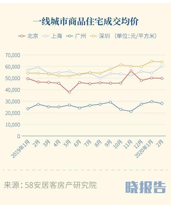 销售面积同步下降,但买房价格却在上涨。数据显示,一线城市商品住宅成交均价,保持平稳微涨的态势。尤其是上海和深圳,2月份成交均价超6万元/平方米,是近一年以来的新高。