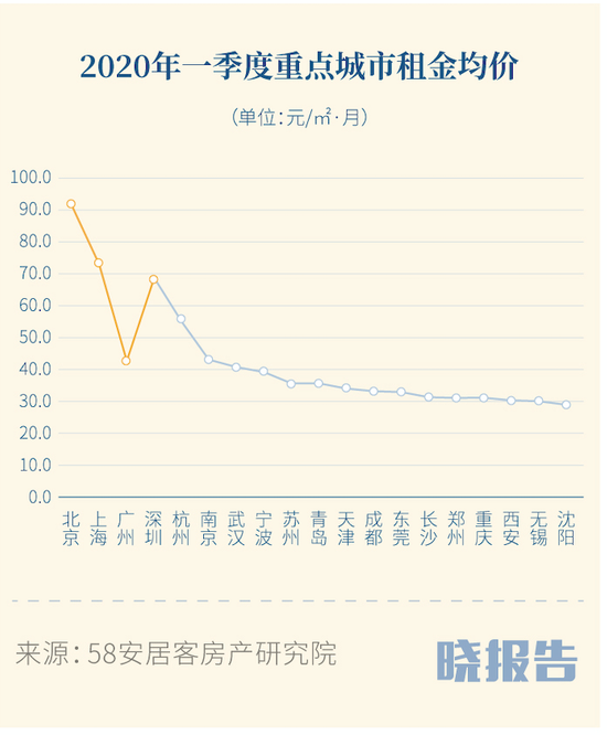虽受疫情影响,但今年一季度租金的跌幅并不明显。数据显示,重点19城的平均月租⾦在41.0元/㎡,同⽐只下降0.8%。