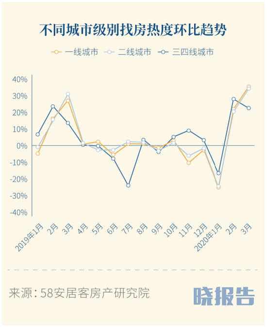 从全国找房热度来看,虽然1⽉的数据环⽐下跌明显。但随着疫情逐步被控制,2—3⽉找房热度环⽐出现明显回升。尤其是⼀⼆线城市,3月找房热度环⽐涨幅均超过30%。
