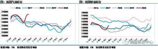 出现问题的不止是美国原油库存,美国汽油和柴油库存情况也并不是很乐观,尤其是美国汽油库存,在本该进入季节性去库存的阶段重新回到年内高点。由于出行频率和开车需求的下滑,美国汽油需求直线下滑,即便是在金融危机时期,我们也未曾看到如此猛烈的冲击。目前美国汽油库存已经达到历史峰值,同期对比来看更是高出了不少。