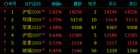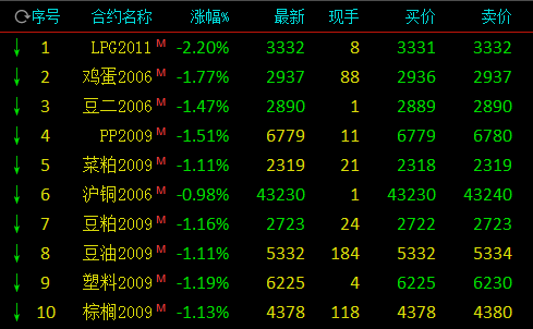 5月12日,国内期市延续夜盘走势,多数飘绿,沪铅(14300, 440.00,3.17%)涨近3%,动力煤(517, 8.80, 1.73%)拉升涨近2%。农产品多数下跌,鸡蛋(2894, -96.00, -3.21%)、豆二、菜粕、豆粕(2724, -31.00,-1.13%)、豆油跌逾1%。