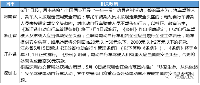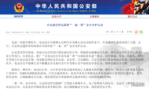 4月21日公安部交管局下发在全国部署“一盔一带”安全守护行动通知,要求5月14号加入交管监控系统,自6月1号起,依法查纠摩托车、电动自行车驾乘人员不佩戴安全头盔以及骑车驾乘人员不使用安全带行为。