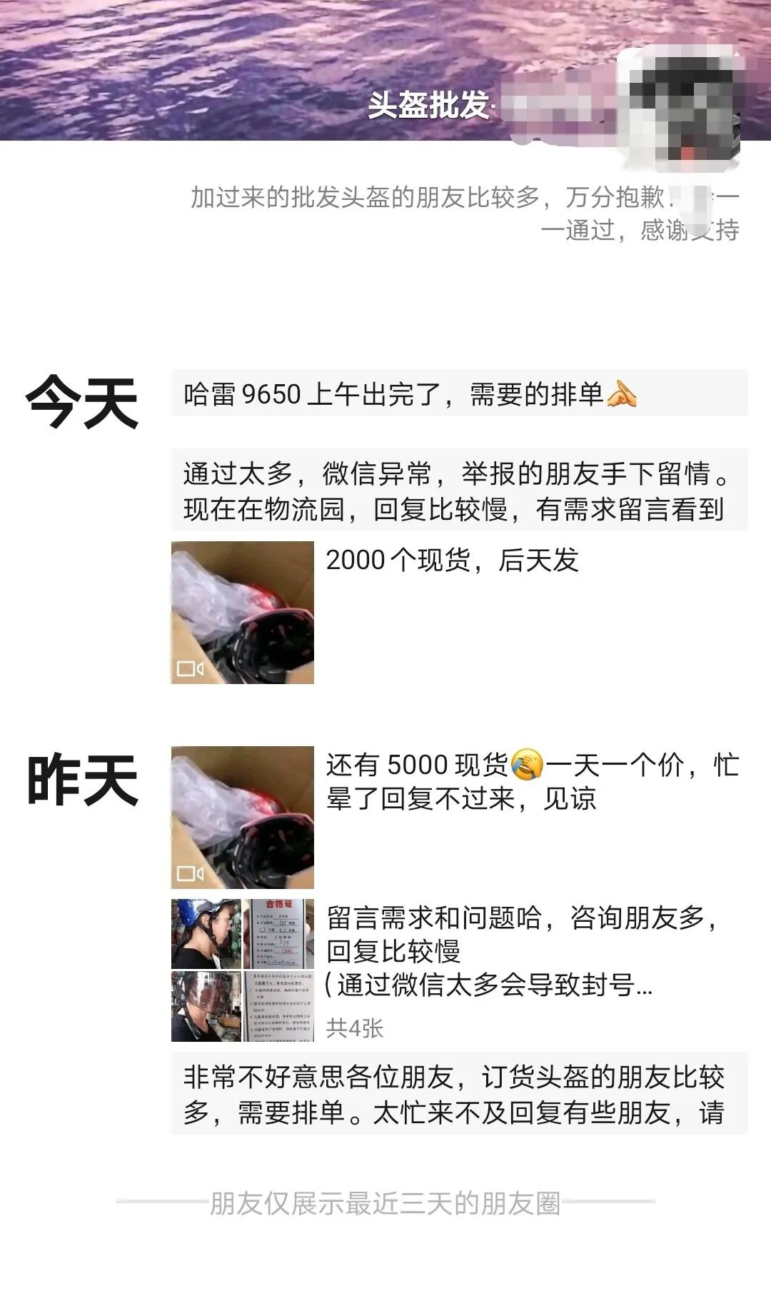 每日经济新闻记者近日也联系了多位头盔批发商,但多数电话处于忙音状态,记者又尝试加微信,也是在等待了将近一天后才显示通过。批发商金晨(化名)向记者解释称,因为担心通过微信太多会导致封号。5月20日一早,他又发了一条朋友圈,称“通过太多,微信异常,请举报的朋友手下留情”。
