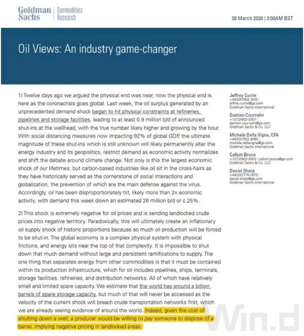 3月下旬,高盛原油策略师 Jeffrey Currie 一语震惊商品交易员,称内陆原油如WTI 交易价格可能在很近的将来陷入负值,因为原油和汽油需求骤降,同时还伴随着沙特与俄罗斯的原油价格战。Jeffrey Currie 的观点至今令人印象深刻,因为WTI原油在其发布报告20天后,真的跌入负值;而且高盛交易部门显然听从了这个建议,准备充分赚了钱。