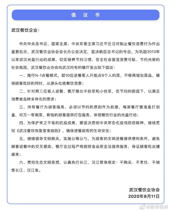 8月11日,武汉餐饮业协会微信公众号发布倡议书,提倡武汉餐饮企业坚持推行“N-1”点餐模式、半份菜小份菜、提供打包盒、公勺公筷、安全就餐、不烹饪长江鱼等六大反对餐饮浪费的“光盘行动”举措。