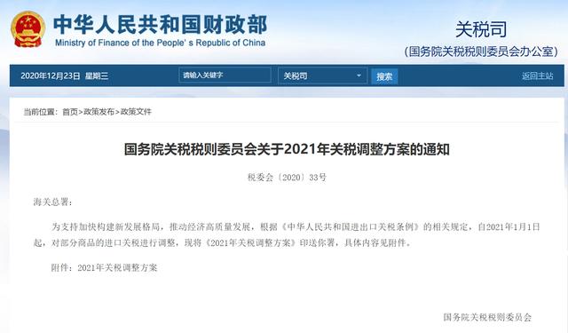 国务院关税税则委员会关于2021年关税调整方案的通知