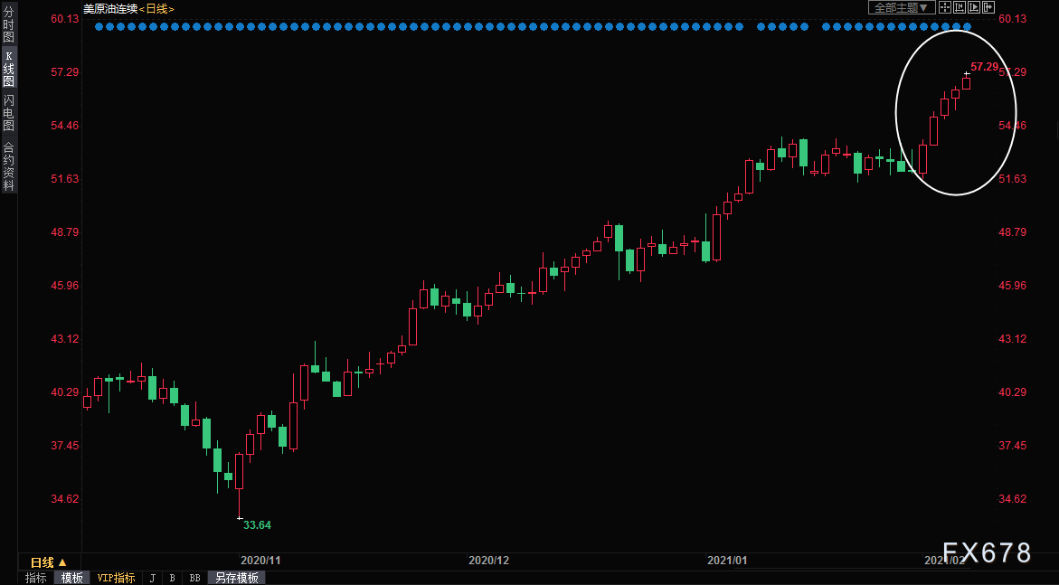 创逾一年新高至57.29美元/桶,收报57.07美元/桶,周线涨幅约9.46%,为10月以来最大单周涨幅;疫苗改善全球经济和原油需求前景,库存下降,OPEC+维持产量不变,美国经济数据改善,拜登刺激计划取得重大进展等因素给油价提供了强劲的上涨动能。