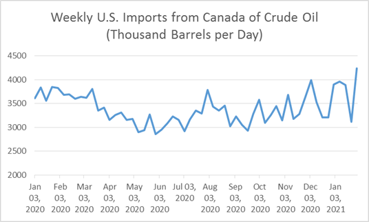 图1:美国从加拿大进口原油周度数据(单位:千桶/日)