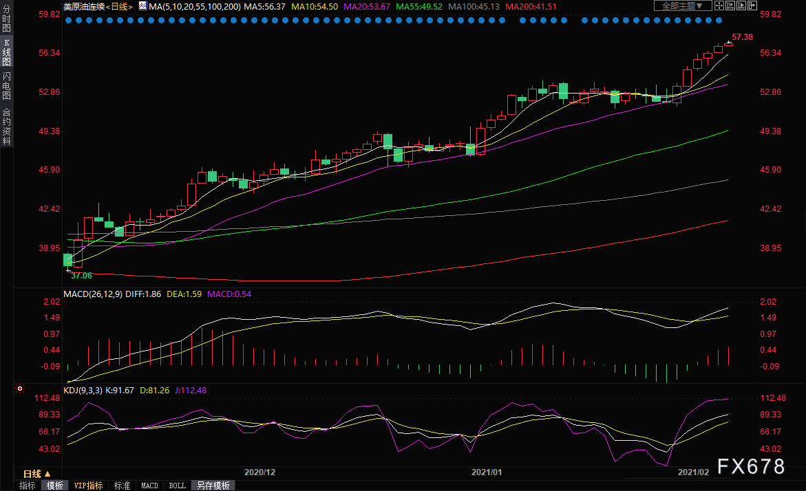 最高触及57.37美元/桶,再创逾一年新高。一方面是美国经济数据改善帮助美国股市大涨创历史记录新高,另一方面是OPEC+维持产量不变,并预计夏季会出现攻击短缺;这些都是建立在疫苗能够终结新冠疫苗的预测背景下。