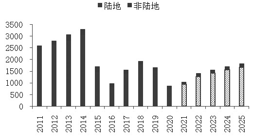 图为陆地常规与非常规钻井服务资本支出(亿美元)