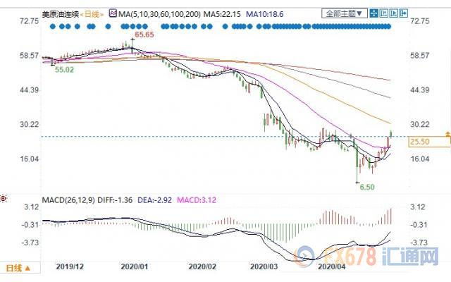美国WTI 6月原油期货电子盘价格周三(5月6日)收盘下跌0.99美元,跌幅3.74%,报25.50美元/桶。油价急挫逾3%,因美国原油库存增加,柴油库存猛增,抵消了石油输出国组织(OPEC)主导的减产带来的提振,以及随着部分国家解封,需求将复苏的希望。
