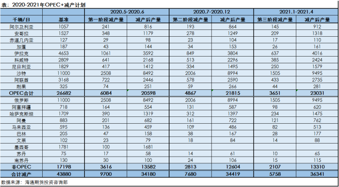 在第一阶段的减产协议中,OPEC承担了608万桶/日的减产任务,非OPEC承担362万桶/日的减产任务,整体减产量达到了970万桶/日,整体的OPEC产量下滑至2060万桶/日,为近20年以来的最低产量水平;在第二阶段的减产协议中,OPEC承担487万桶/日的减产任务,非OPEC承担281万桶/日的减产任务,合计减产768万桶/日,较第一阶段减产协议下降202万桶/日;在第三阶段的减产协议中,OPEC承担365万桶/日的减产任务,非OPEC承担211万桶/日的减产任务,合计减产576万桶/日,较第一阶段减产协议下降394万桶/日。