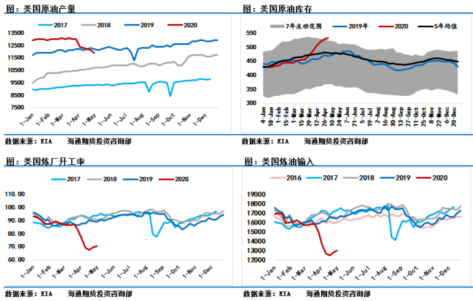 目前原油市场关注的焦点仍在供给端和需求端,供给端提供短期的底部,但需求端提供上方的顶部。本周后半周油价回调,说明目前供给端的努力仍不足以支撑价格回升到页岩油成本线附近。当前市场大跌的风险已经被充分化解,大涨的可能性暂时也看不到,在经历了3—4月份的刺激行情之后,原油价格很有可能进入到振荡期,市场何时突破需要关注需求的恢复情况和陆上库存何时能够出现实质性的下降。