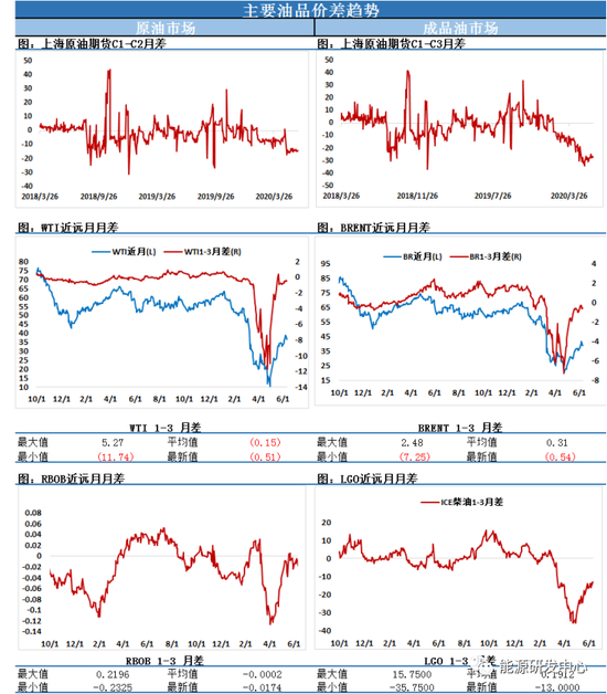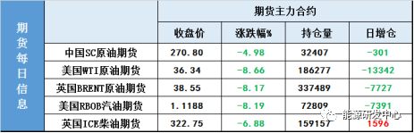 【1】WTI 主力原油期货收跌3.43美元,跌幅8.66%,报36.34美元/桶;布伦特主力原油期货收跌3.41美元,跌幅8.17%,报38.55美元/桶;INE原油期货主力合约夜盘收跌4.98%,报270.8元/桶。