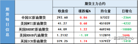 【1】WTI 主力原油期货收涨0.28美元,涨幅0.68%,报41.27美元/桶;布伦特主力原油期货收涨0.53美元,涨幅1.22%,报44.09美元/桶;INE原油期货主力合约夜盘收涨0.86%,报292.6元/桶。