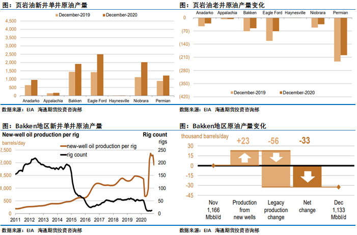 不仅如此,技术进步带来的开采速率提升也使得美国新井单井产量有了较大的提升,尤其是在产量较大的Bakken、Eagle Ford以及Permian地区,其中Eagle Ford地区单井产量提升最为明显。具体分区域来看,Bakken地区新井单井原油产量在低油价时期出现了迅猛增长,不过考虑到老井的退出,Bakken地区产量仍有较大的下滑。Eagle Ford地区以及Permian地区的情况与Bakken地区类似,通过单井产量的提高来弥补钻井平台数的下滑,进而使得产量下滑维持在相对稳定的区间。