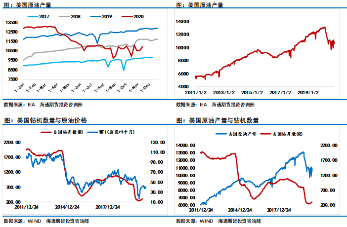 我们之前很早就论述过油价、钻井平台数和美国原油产量三者之间的关系。正常情况下,从油价传导至钻井平台数的时间大概是2—3个月,从钻井平台数传导至原油产量的时间大概也是2—3个月。但在极端情况下比如今年,传导的速度明显加快了,美国原油产量几乎和价格同步下行、同步筑底,这样反映出页岩油的开采灵活。
