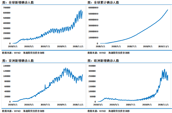 截至周五,全球新增确诊病例64万人,累计确诊病例5725万人。其中,亚洲地区新增确诊病例10.7万人,欧洲地区新增确诊病例25.2万人,非洲地区新增确诊病例1.3万人,美洲地区新增确诊病例27万人,疫情的主要暴发地仍然集中在欧洲和美洲。分国家来看,美国单日新增病例数再创历史新高,英国单日新增2.3万人,法国单日新增2.1万人,印度单日新增4.6万人,除了美国之外,其他国家的新增病例似乎是稳住了,并未出现继续飙升的情况。