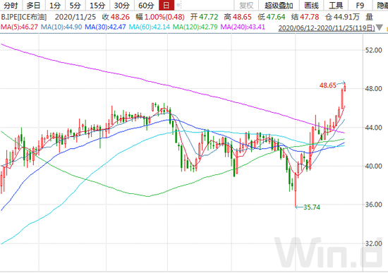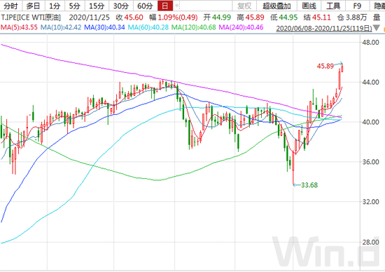 11月25日盘中,原油价格继续拉升,美油、布油双双刷新年内反弹高点。WTI原油上破45美元,ICE布油上破48美元。