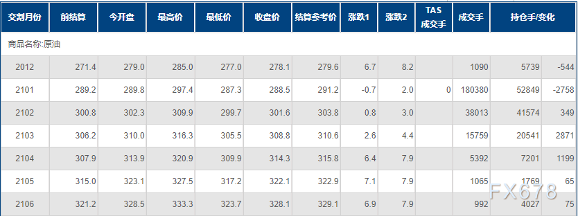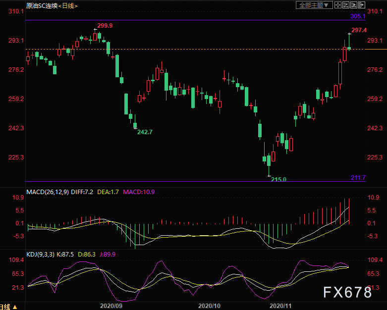 上海原油价格盘中大涨2.84%,创9月1日以来新高297.94元/桶,直逼上方强阻力位300关口,不过随后回落,主力合约2101终盘收于288.5元/桶,跌0.7元/桶,跌幅0.24%。