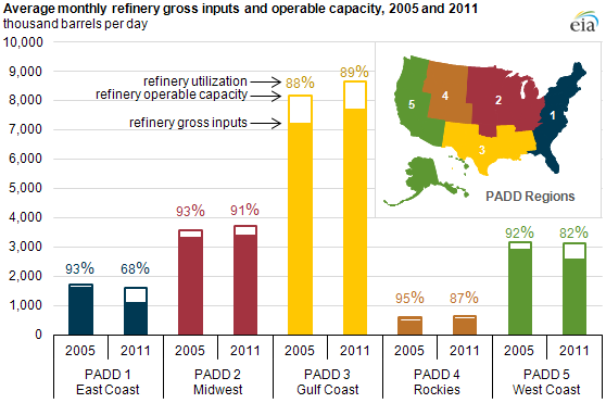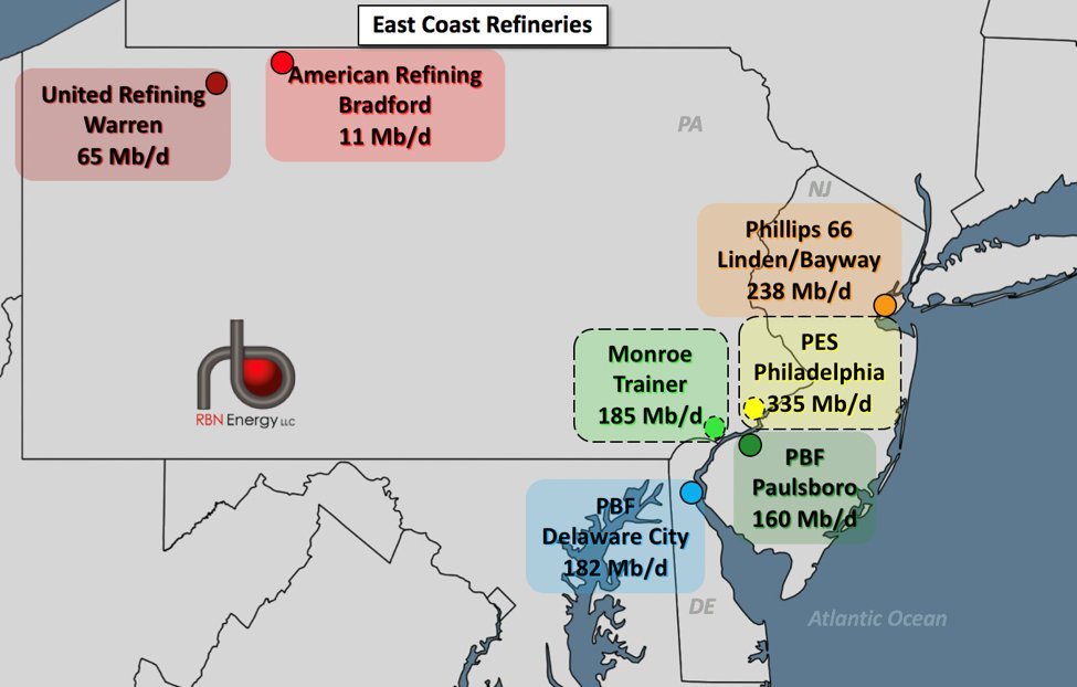 到了2010年前后,经过多年挣扎,整个东北部所剩的炼厂已经不多。变成这样,归根结底还是本地石油资源逐步枯竭。而1970年代以来一轮轮环保运动,也使得老旧炼厂逐步被废弃。最终,美国绝大部分炼力,集中到了有本地资源资源、物流相对便利、环境容量较大的墨西哥湾沿岸地区,尤其是石油之都休斯敦。整个新英格兰地区(PADD1A)已经没有一座炼厂,东海岸全部6个炼厂都集中在中大西洋地区(PADD1B),也就是纽约和费城周边,其中5个集中在特拉华河下游。2008年金融危机让这些幸存者步履维艰,然后就碰上页岩油革命,它们不得不承受Brent-WTI的高价差,炼厂规模没优势,进料成本吃大亏。