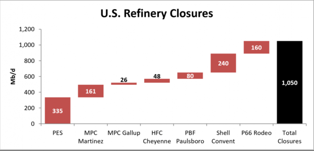 这波炼厂关停潮波及了除中西部(PADD2)以外的各个地区。东海岸(PADD1)是最大的重灾区,大约关闭了1/3的炼能。首当其冲的就是去年夏天大爆炸的费城能源解决方案(PES)炼厂,一次加工能力33.5万/天,是东海岸最大的炼厂。这还不算,PBF准备整合18.2万桶/天的特拉华城炼厂和16万桶/天的鲍尔斯伯勒炼厂,后者的部分装置被关停,因此损失了8万桶/天的炼力。要知道,东海岸炼厂拥挤在费城-纽约这条线上,一共才6个炼厂就有2个要被部分或者完全关停。结果,一口气擦掉了一个2000万吨炼厂,相当于一个恒力石化或者半个浙江石化。美国东北部炼厂的生死可能牵一发而动全身,不仅会干扰未来美国成品油物流,甚至还会破坏整个北大西洋两岸的原油和成品油平衡。