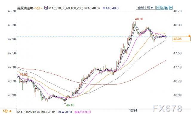 美国WTI 2月原油期货电子盘价格周三(12月23日)收盘上涨1.04美元,涨幅2.21%,报48.06美元/桶。油价周三上涨逾2%,受美国原油、汽油和馏分油库存减少提振,库存下降提振了投资者对燃油需求一定程度回升的希望。