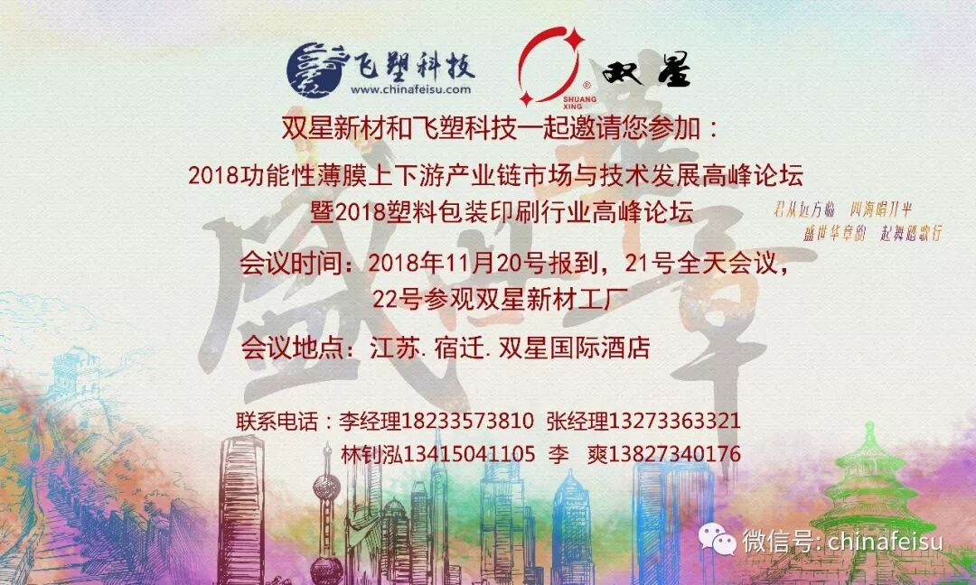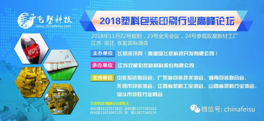 飞塑科技经过7年多踏踏实实、一步一个脚印的发展,积累了一定的专业知识和一定的人气,感谢广大塑友的支持和信赖,为了回馈广大塑友的支持,我们飞塑科技和我们多年的合作单位——上市膜企——江苏双星彩塑新材料股份有限公司一起合作,特召开本次“2018功能性薄膜暨包装印刷行业高峰论坛”为广大塑友提供宣传、认识、交流、沟通的平台和机会。特别感谢本次峰会还得到了中国包装联合会领导们的大力支持!
